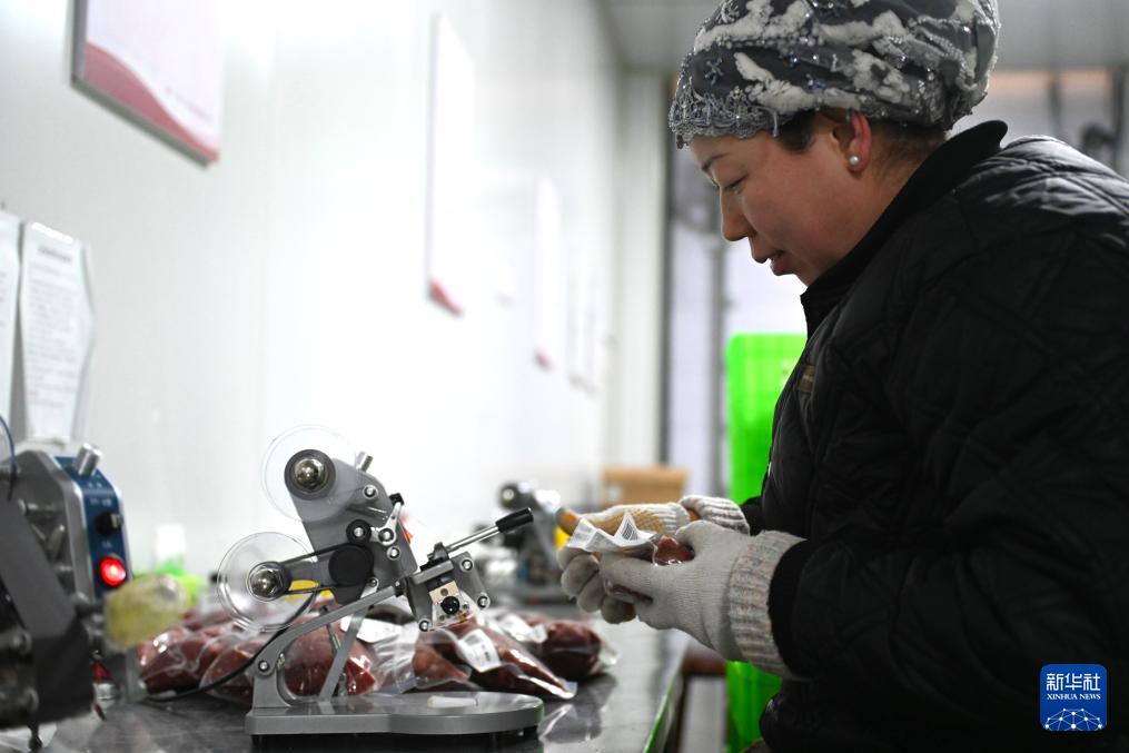1月6日,工作人員在寧夏固原市涇源縣源牛農(nóng)牧科技有限公司為黃牛肉產(chǎn)品貼標(biāo)簽。