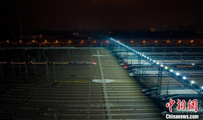 14日凌晨3時(shí),在武漢動(dòng)車段存車線上,百余組動(dòng)車整齊排列,勢如“陸地航母”,即將啟航迎接回家的人們。(完)