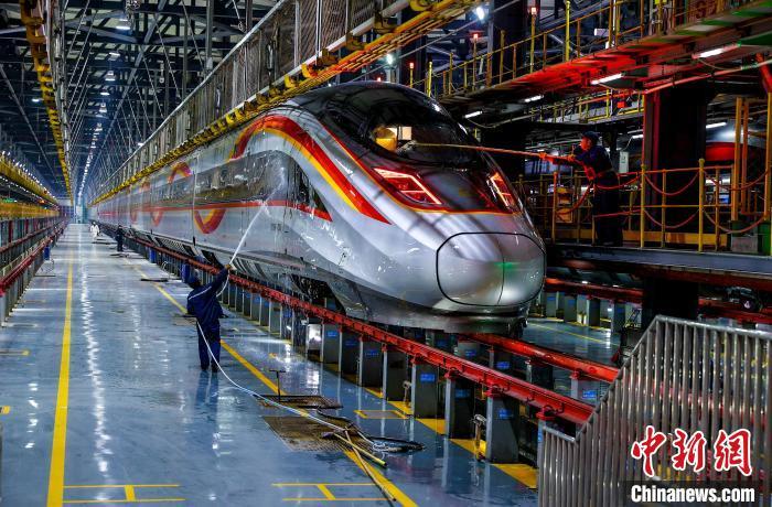 圖為修理庫中,工作人員清洗動(dòng)車?!垥?攝