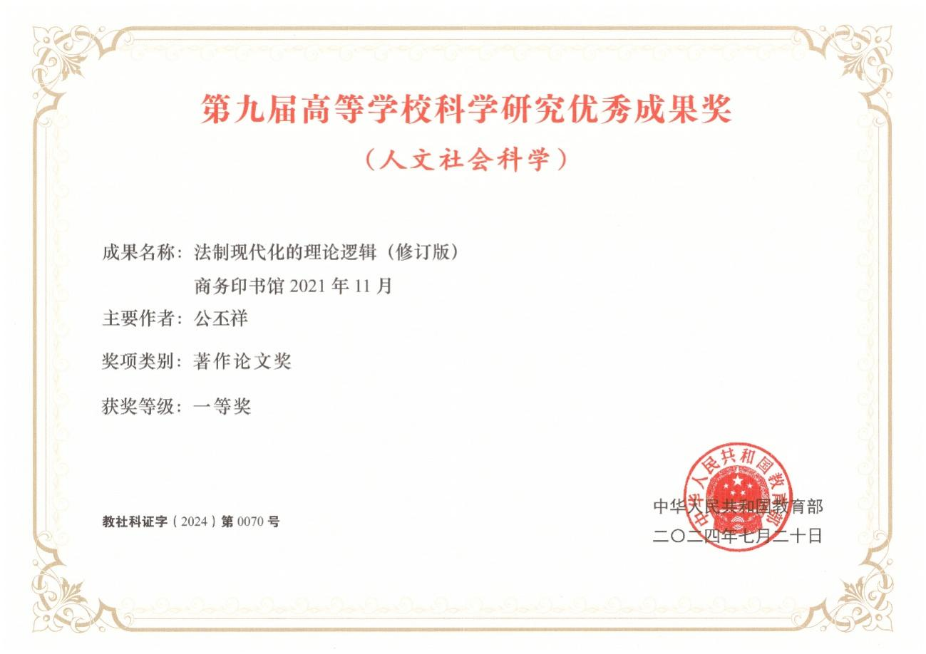 《法制現(xiàn)代化的理論邏輯(修訂版)》榮獲第九屆高等學(xué)校科學(xué)研究優(yōu)秀成果獎(人文社會科學(xué))一等獎
