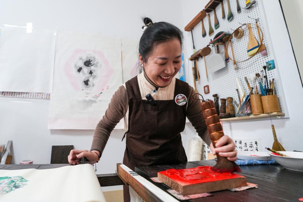 1月19日,游客在一團(tuán)和氣館中體驗(yàn)桃花塢木版年畫產(chǎn)品。新華社發(fā)