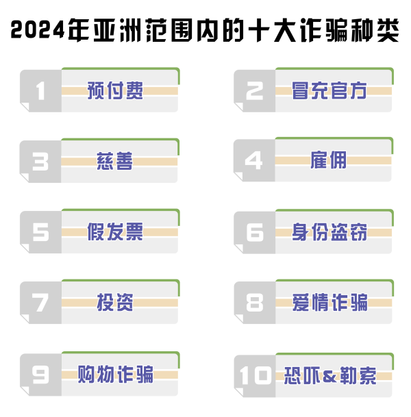 根據(jù)《2024年亞洲詐騙報(bào)告》,統(tǒng)計(jì)2024年亞洲范圍內(nèi)13個(gè)國(guó)家及地區(qū)詐騙種類前三名,計(jì)算后得出,身份盜竊、投資詐騙、購(gòu)物詐騙成為出現(xiàn)頻率最高的詐騙類型,占比均為23.08%。此外,冒充官方、政府機(jī)關(guān)人員實(shí)施詐騙占比達(dá)到10.26%,同樣需要引起重視。