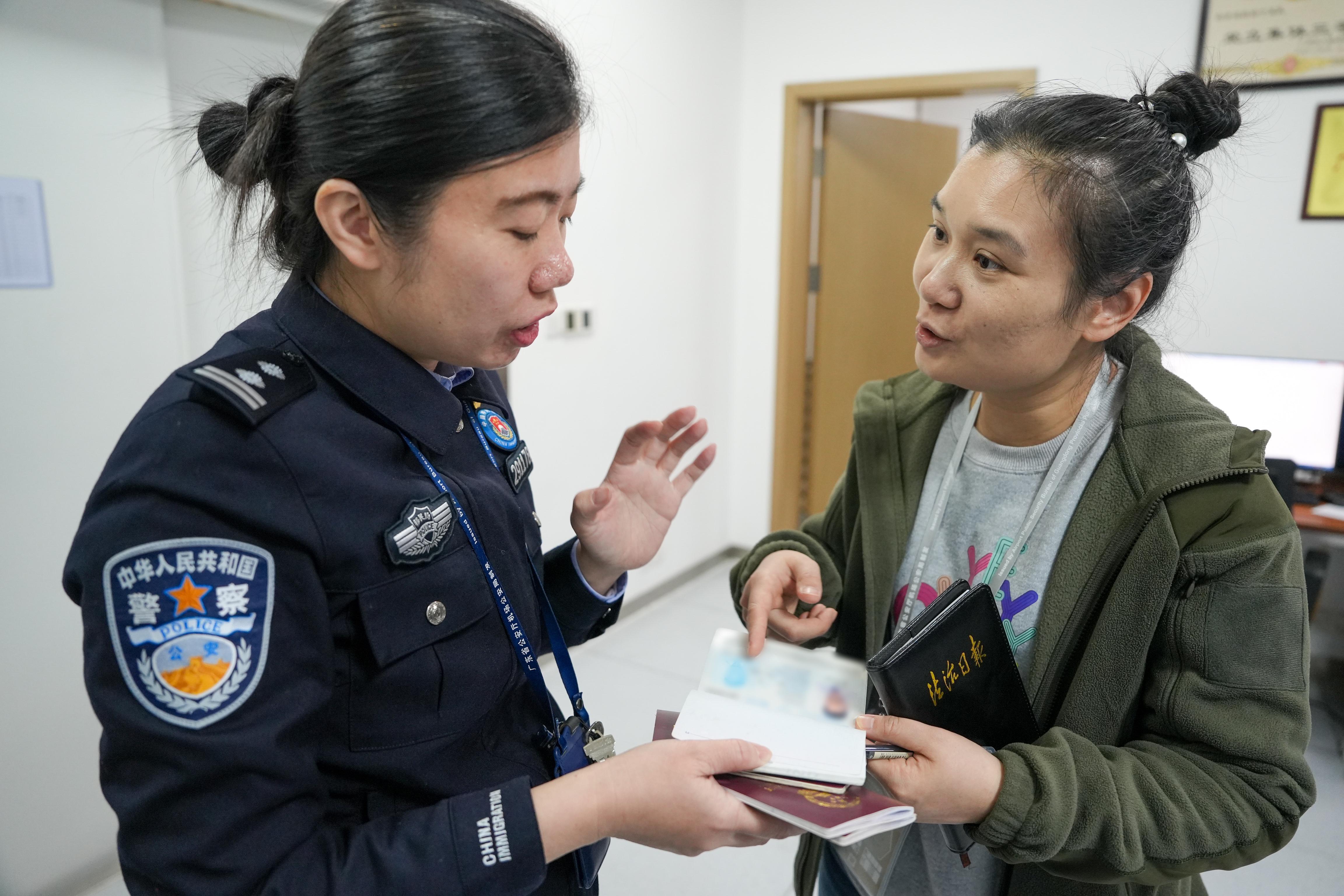 白云邊檢站民警向記者介紹春運(yùn)工作情況。