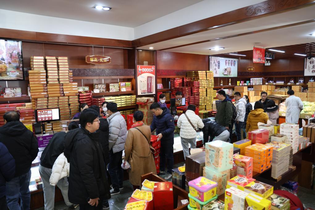 臨近除夕,天津桂發(fā)祥十八街麻花旗艦店內(nèi)人頭攢動(dòng),以麻花為主的年貨商品包裝精美、琳瑯滿目,多個(gè)收銀臺(tái)前叫單不斷、排起長(zhǎng)隊(duì)。