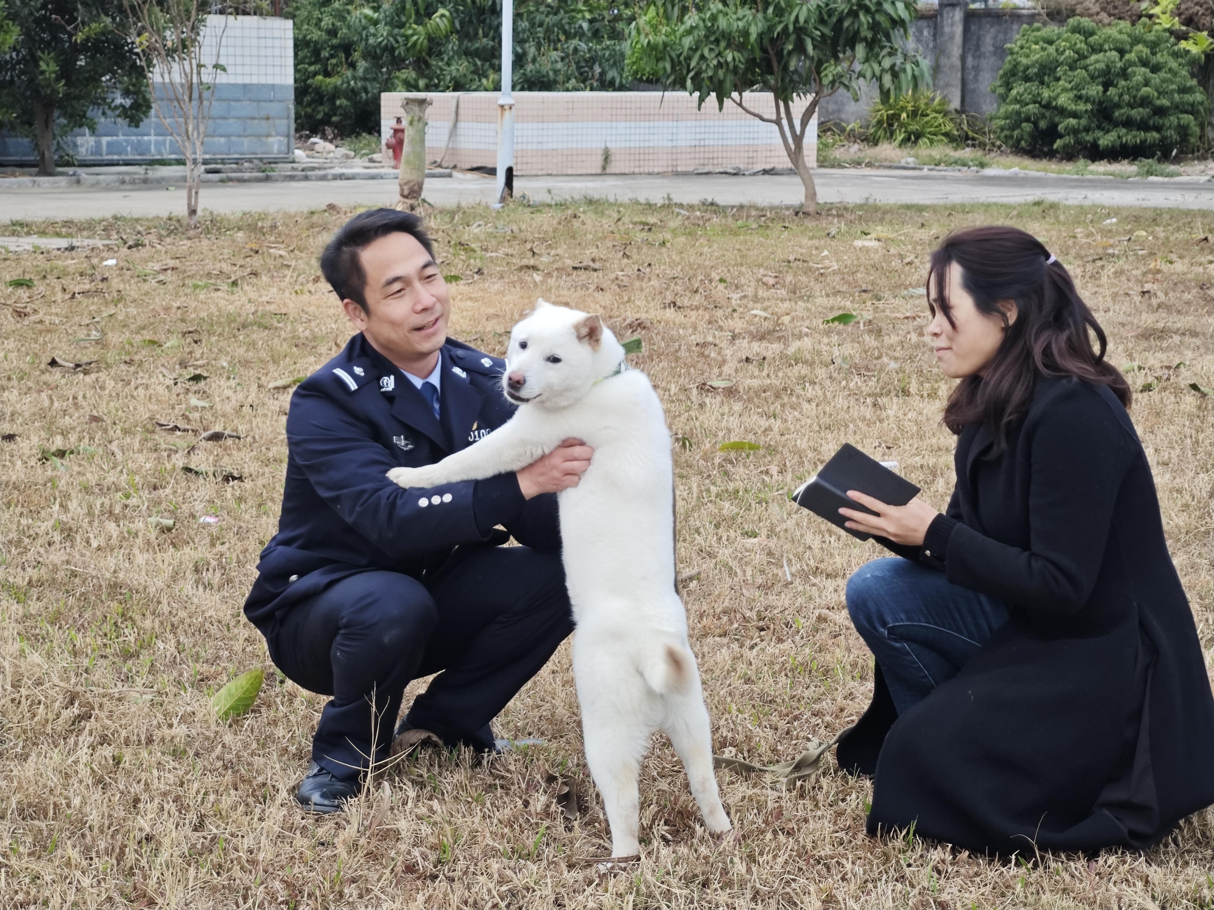 說話間,兩名訓(xùn)導(dǎo)員帶著他們的山地警犬從犬舍中走了出來,其中一身白毛的名叫小龍女,訓(xùn)導(dǎo)員剛一松手,它就直奔記者而來,后腿直立著把兩只前爪搭在記者的左腿上,在眾人的笑聲中,迅即跑開,撲向另一人。和小龍女的活潑不同,另一只小布丁則顯得很文靜,在記者試圖給它拍照時(shí),它迅速躲到了訓(xùn)導(dǎo)員羅飛亮的身后。羅飛亮蹲下身,輕輕地拍它的背,撫摸它的頭,安慰著它。