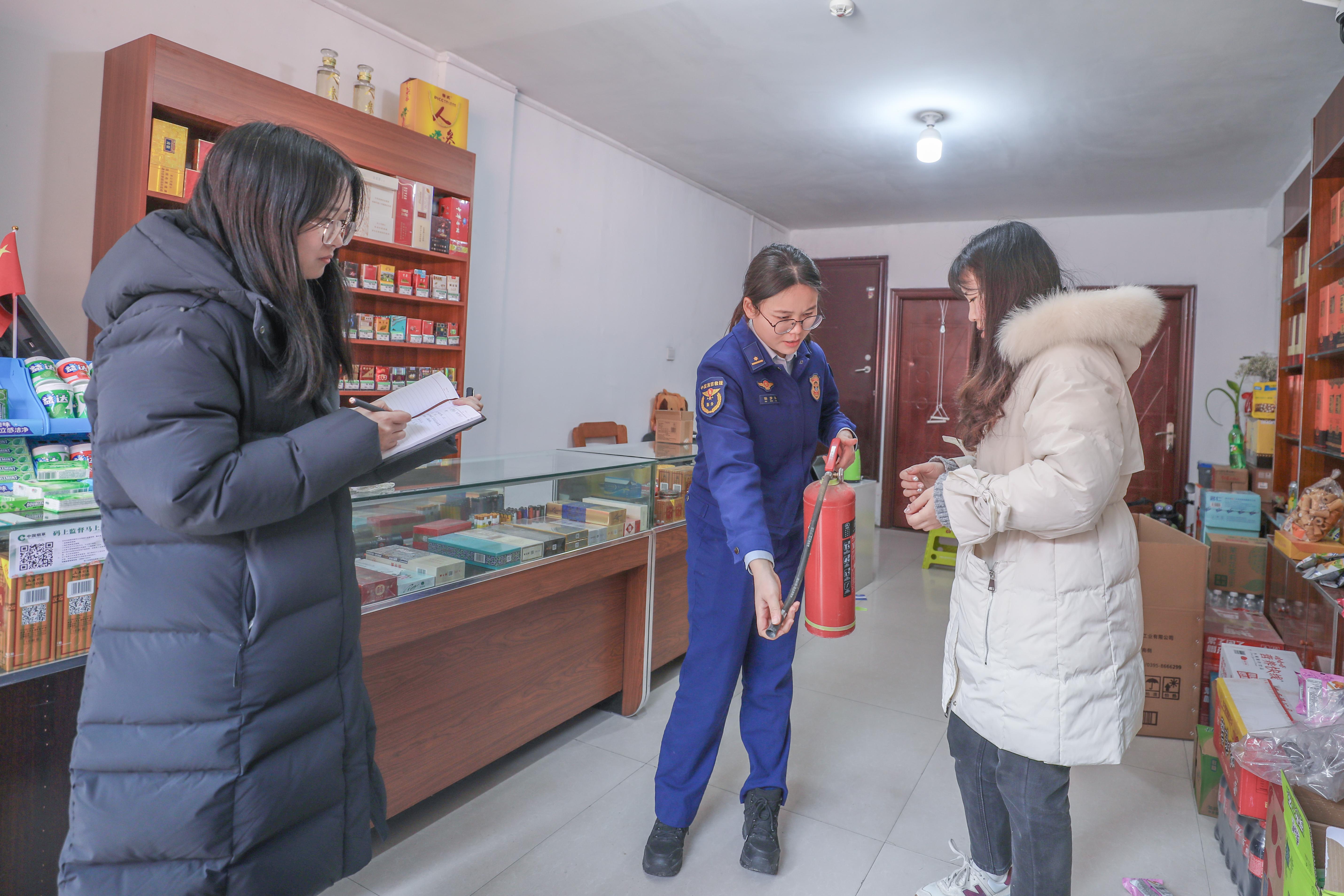 圖為川匯區(qū)消防救援大隊初級專業(yè)技術職務侯夢華(左二)在關帝廟歷史文化街區(qū)向商戶宣傳消防安全知識及滅火器正確使用方式,記者(左一)在現(xiàn)場采訪。法治日報通訊員 鄧碩宇 攝