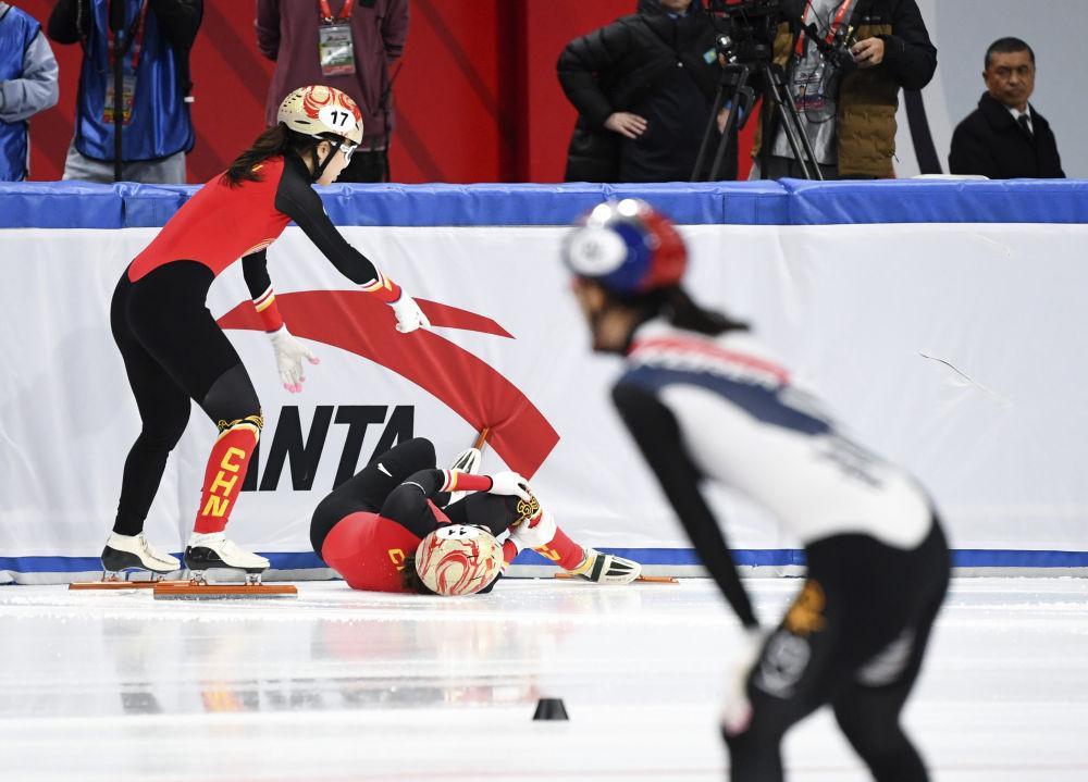 2024年12月7日,中國隊選手王曄(中)在2024-2025賽季國際滑聯(lián)短道速滑世界巡回賽北京站女子3000米接力A組決賽中受傷。新華社記者 鞠煥宗 攝