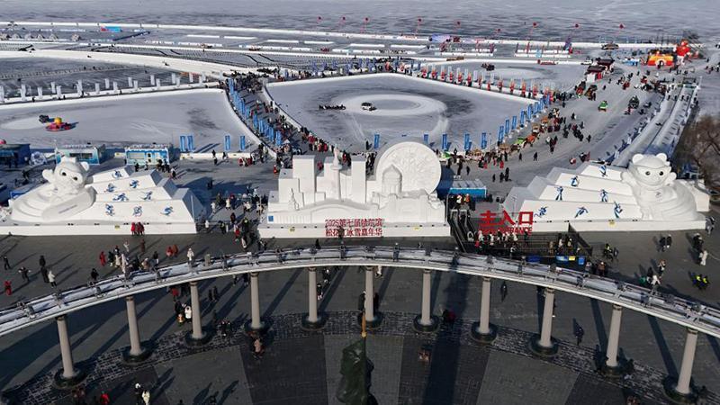 這是1月8日在哈爾濱道里區(qū)的防洪紀(jì)念塔廣場(chǎng)拍攝的亞冬會(huì)吉祥物雪雕“濱濱”和“妮妮”(無(wú)人機(jī)照片)。新華社記者 王松 攝