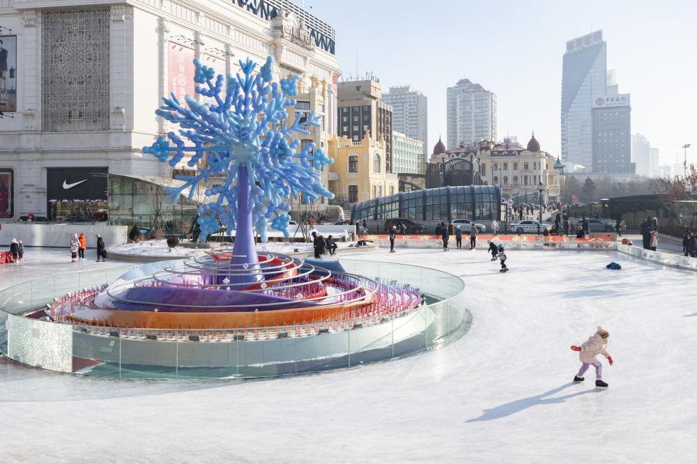 1月4日,在哈爾濱市南崗區(qū)一處公益冰場,人們在“冰雪之冠”雕塑旁滑冰。新華社記者 謝劍飛 攝
