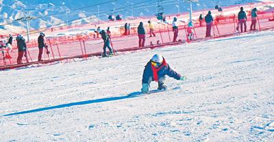 新疆阜康市天山天池國際滑雪場,雪友在體驗滑雪樂趣。