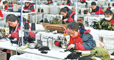 山東嘉祥縣,工作人員在濟寧全成手套有限公司生產(chǎn)車間縫制滑雪手套。