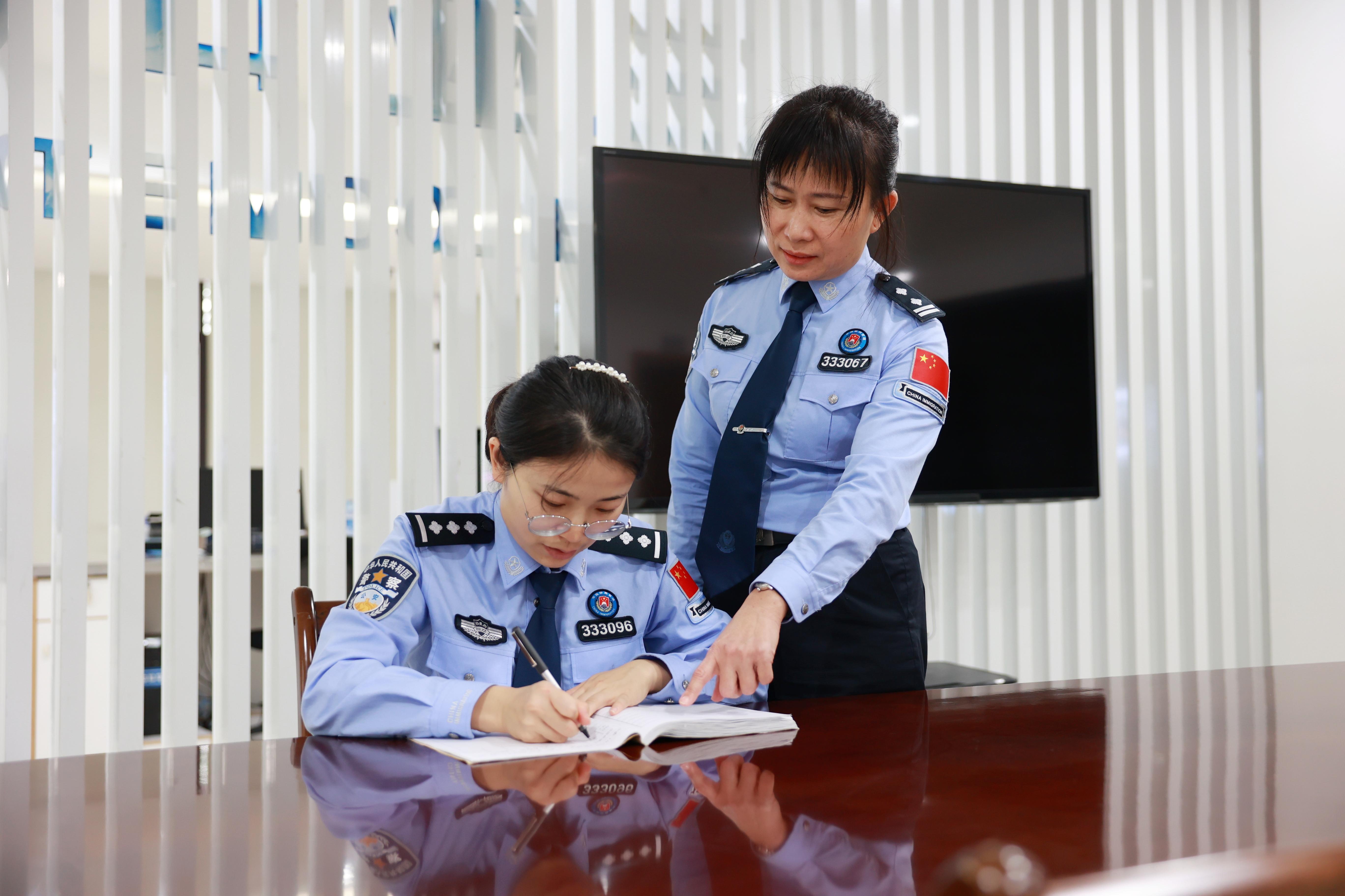 圖為三亞邊檢站執(zhí)勤一隊民警符免納春節(jié)期間堅守在口岸執(zhí)勤一線幫扶新民警。