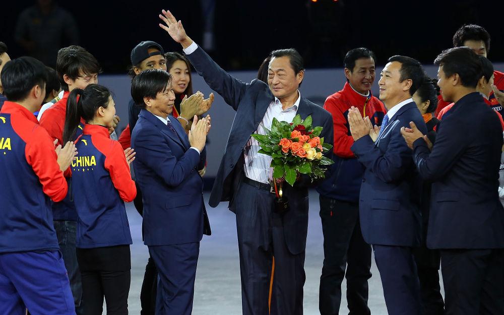 資料圖:中國花樣滑冰隊總教練姚濱(中)在頒獎儀式上向觀眾揮手致意。當日,2015奧迪中國杯花滑大獎賽在北京首都體育館落幕。在比賽后,姚濱獲頒終身成就獎。新華社記者 曹燦 攝