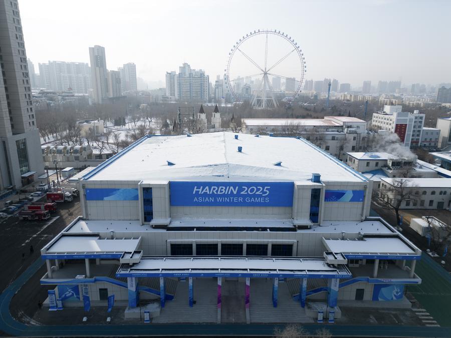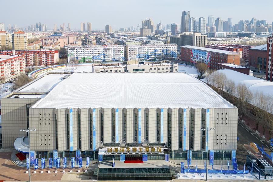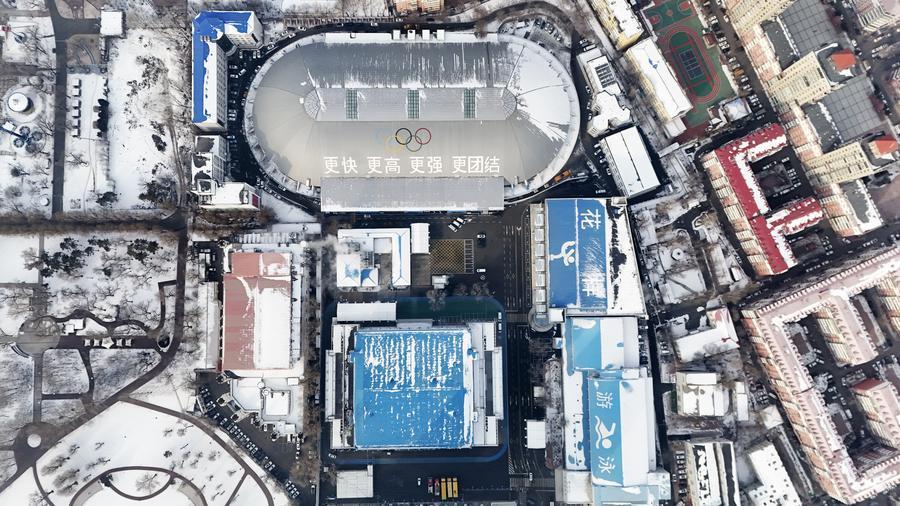 這是1月21日拍攝的哈爾濱體育學院大學生滑冰館(女子冰球比賽場館)(無人機照片)。新華社記者 王松 攝