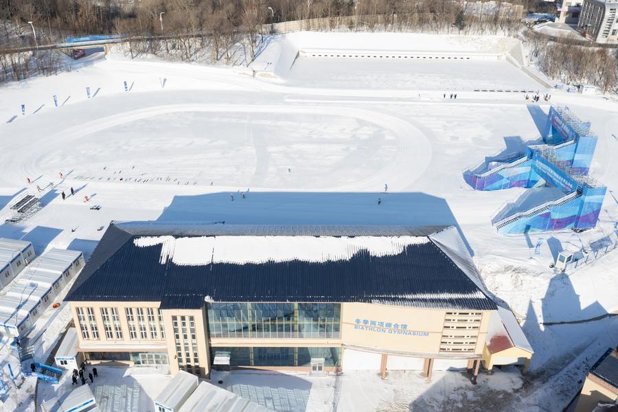 這是1月16日拍攝的位于亞布力滑雪場內(nèi)的第九屆亞冬會冬季兩項比賽場地(無人機照片)。新華社記者 謝劍飛 攝