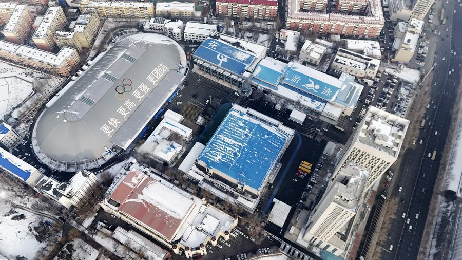 這是1月27日拍攝的黑龍江省冰上訓練中心速滑館(速度滑冰比賽場館)和黑龍江省冰上訓練中心綜合館(短道速滑、花樣滑冰比賽場館)(無人機照片)。新華社記者 張濤 攝