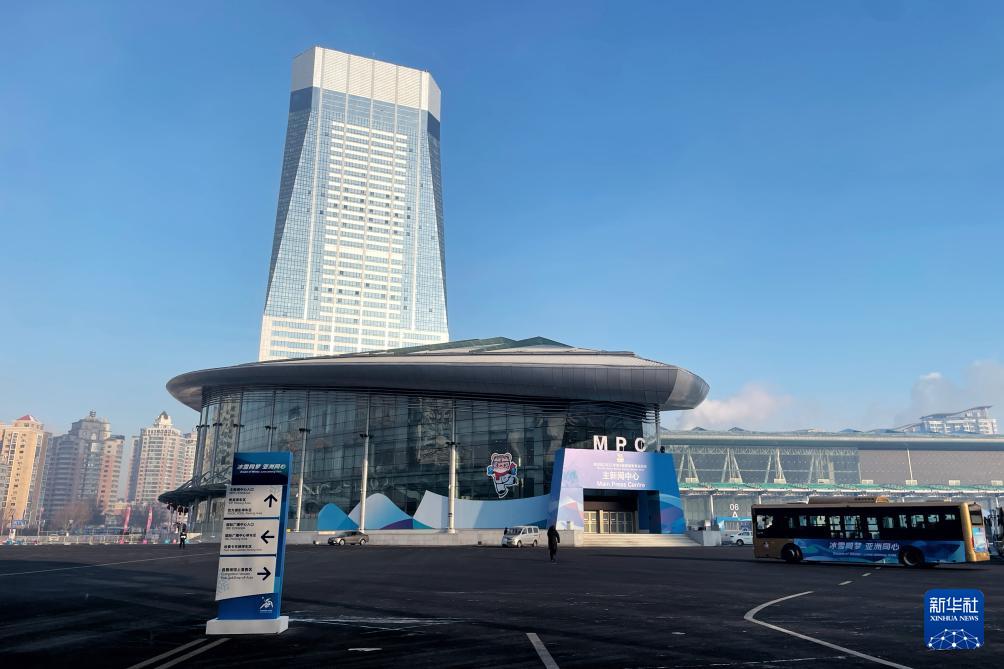 這是2月5日拍攝的第九屆哈爾濱亞冬會(huì)主新聞中心外景。