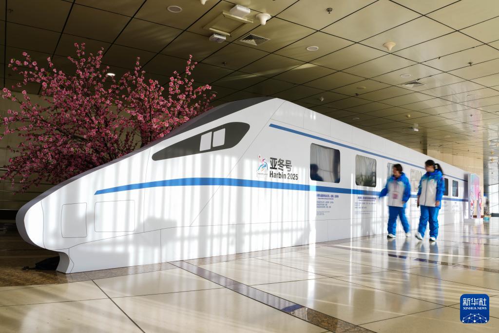 2月5日,志愿者經(jīng)過(guò)主新聞中心的一處亞冬會(huì)主題裝飾。