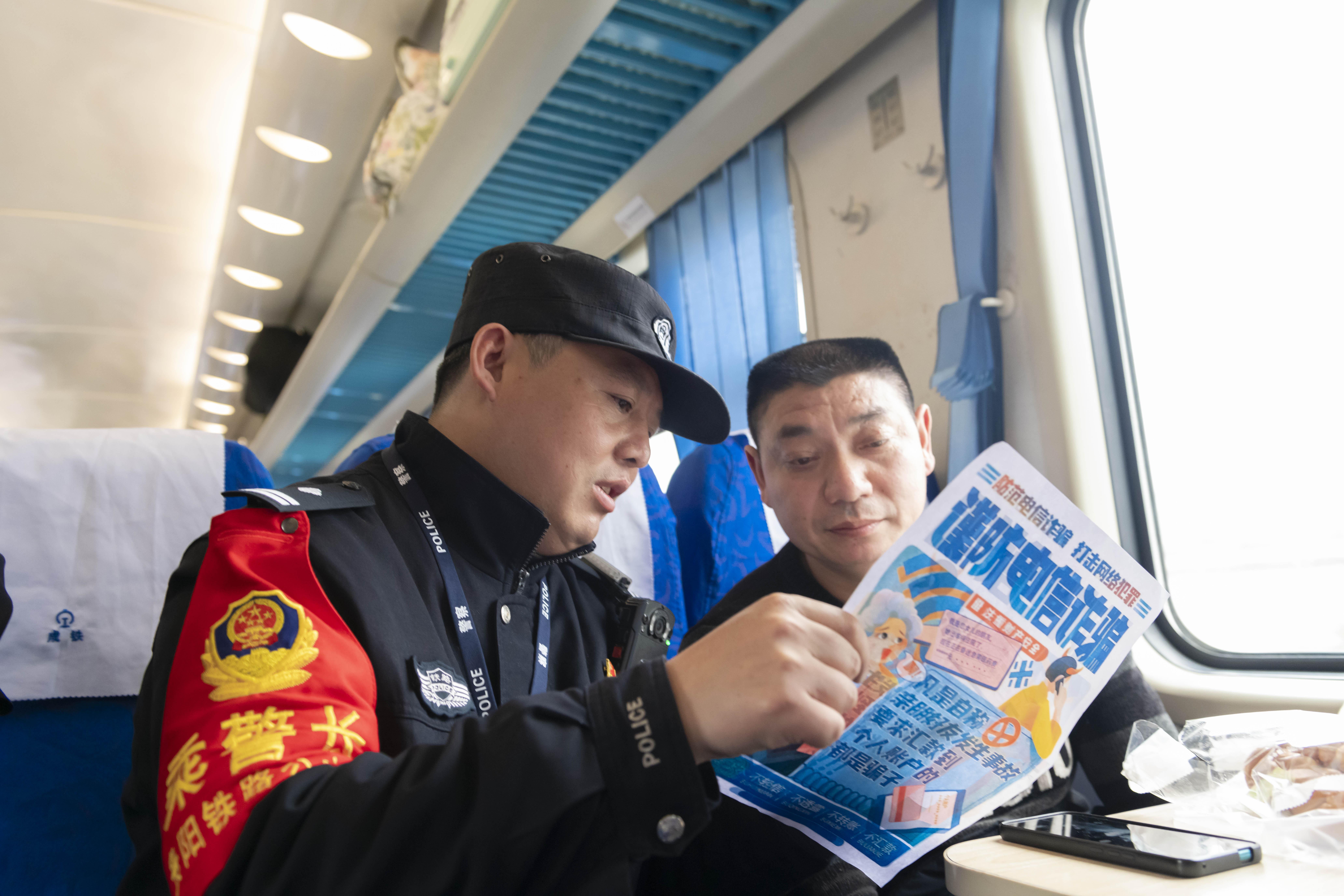 圖為潘廣杰(左)正在向旅客普及防范電信網(wǎng)絡(luò)詐騙知識(shí)。(貴陽(yáng)鐵路公安處供圖)