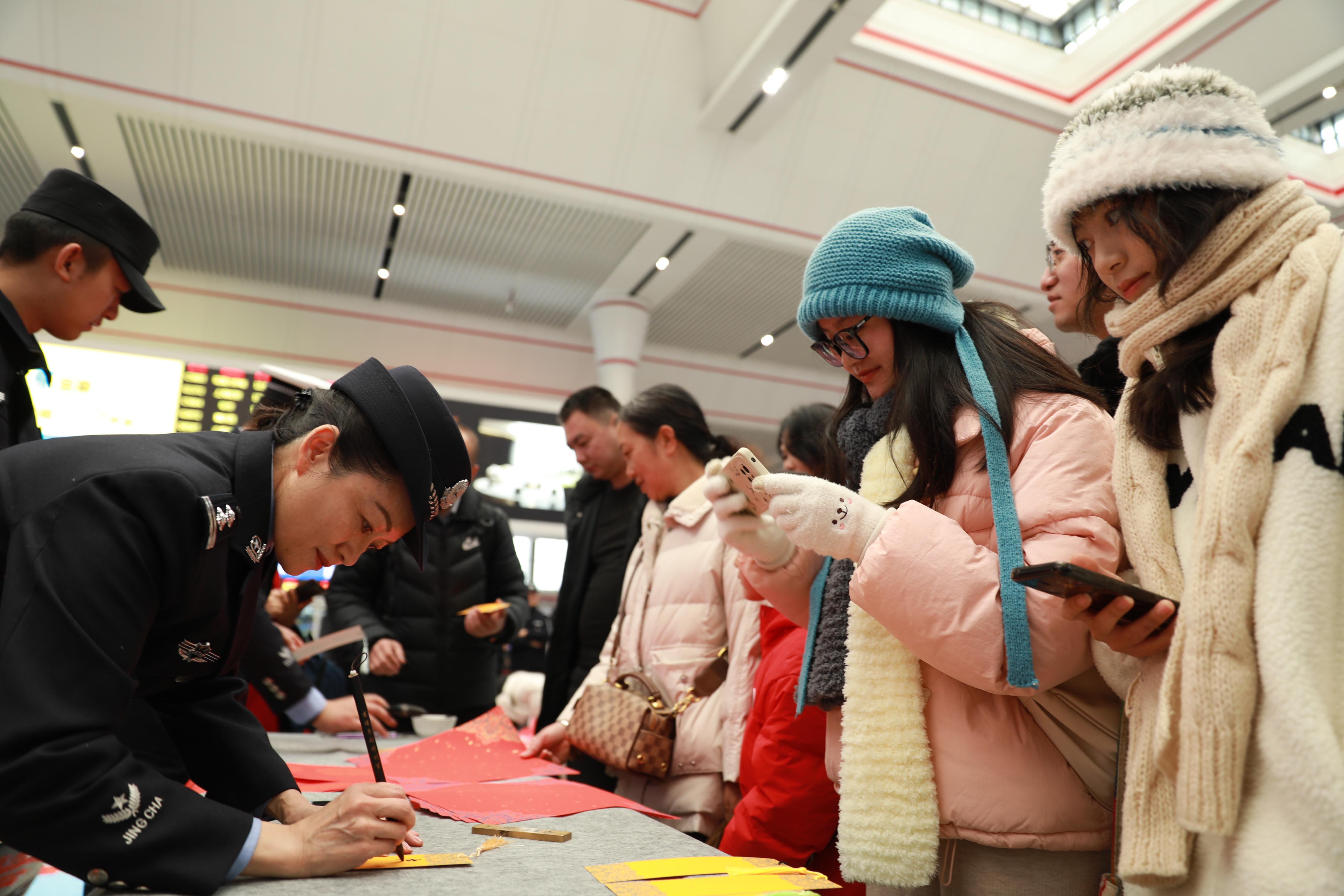 圖為貴陽(yáng)鐵路公安處“鐵警相伴,平安相隨”新春送福字活動(dòng)貴陽(yáng)北站現(xiàn)場(chǎng)。(貴陽(yáng)鐵路公安處供圖)