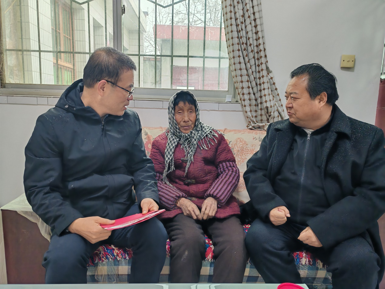 圖為陜西省寶雞市陳倉區(qū)退役軍人事務(wù)局工作人員冒雪慰問賈村鎮(zhèn)楊華烈士遺屬張惠芹(中)。通訊員 莫軍煒 攝