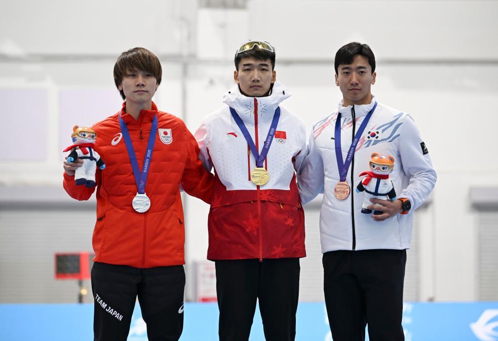 2月10日,冠軍中國選手高亭宇(中)、亞軍日本選手森重航(左)和季軍韓國選手金俊昊在頒獎(jiǎng)儀式上。新華社記者 王曦 攝