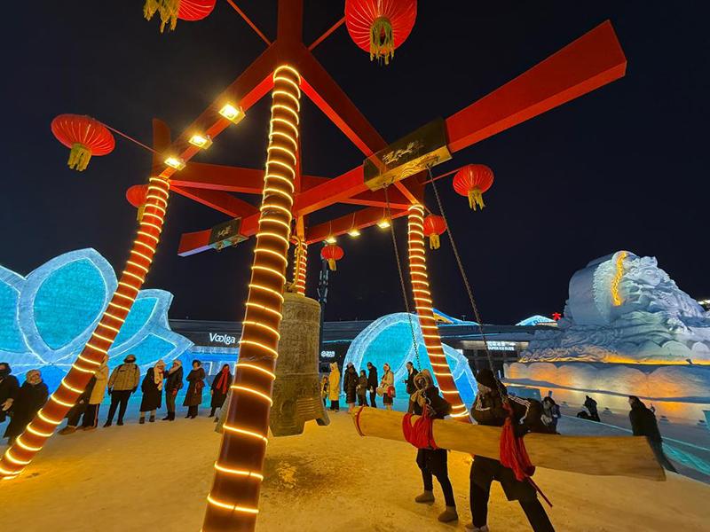 游客敲響哈爾濱冰雪大世界里的世紀(jì)鐘迎接元宵佳節(jié)。新華社記者 楊思琪 攝