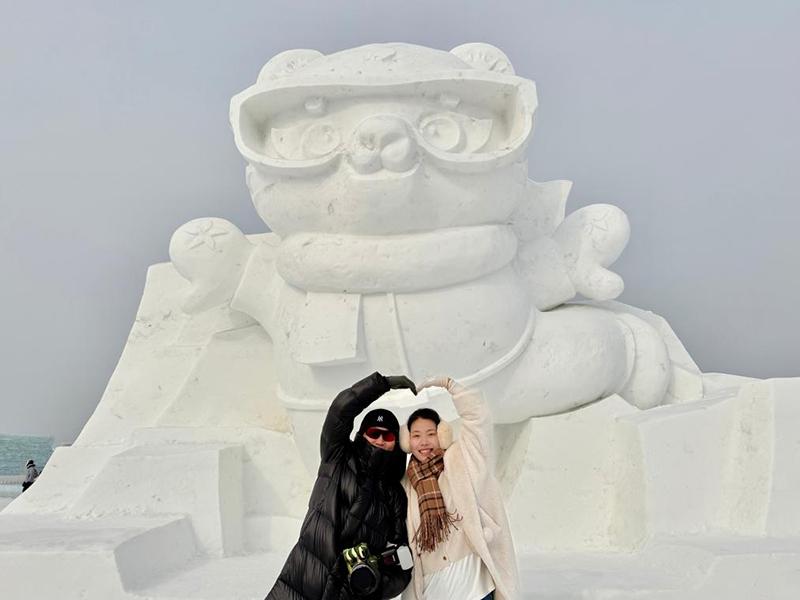在哈爾濱冰雪大世界,來自臺(tái)灣的“95后”游客蔡湘庭正與亞冬會(huì)吉祥物“濱濱”“妮妮”的冰雕、雪雕合影?!皝磉@里正好趕上元宵節(jié),紅彤彤的裝飾和熱情的人們,讓我覺得非常友好?!彼f。