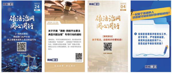 一是做好網(wǎng)信法制建設(shè)展示和解讀。圍繞網(wǎng)絡(luò)領(lǐng)域重點(diǎn)法律法規(guī)和規(guī)章規(guī)定,推出多種形式的原創(chuàng)產(chǎn)品15個(gè),實(shí)現(xiàn)權(quán)威內(nèi)容的新媒體轉(zhuǎn)化。圍繞《促進(jìn)和規(guī)范數(shù)據(jù)跨境流動規(guī)定》推出圖解產(chǎn)品《行為鑒別:關(guān)于數(shù)據(jù)跨境流動的那些事兒》;根據(jù)《網(wǎng)絡(luò)暴力信息治理規(guī)定》推出圖組海報(bào)《為網(wǎng)暴信息治理提供有力支撐!這些亮點(diǎn)值得關(guān)注》。
