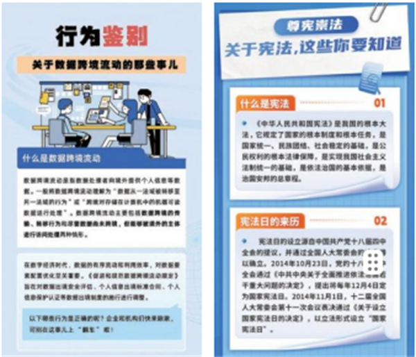 圍繞重點(diǎn)法規(guī)、重要時(shí)間節(jié)點(diǎn),做好權(quán)威內(nèi)容轉(zhuǎn)化,推出多形式的法宣產(chǎn)品、交互活動,從單向式教育向互動式、服務(wù)式、場景式傳播轉(zhuǎn)變。