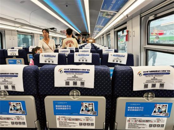 一是打造主題車廂。聚焦“一帶一路”網(wǎng)絡(luò)空間安全和沿線群眾在網(wǎng)絡(luò)法治領(lǐng)域的熱點(diǎn)問題,根據(jù)復(fù)興號(hào)CR200J的車型特點(diǎn),設(shè)置“中國(guó)網(wǎng)絡(luò)法治三十年”“網(wǎng)絡(luò)安全”“數(shù)據(jù)安全”“未成年人網(wǎng)絡(luò)保護(hù)”“數(shù)據(jù)出境之旅”“反網(wǎng)暴凈網(wǎng)行動(dòng)”“個(gè)人信息守護(hù)”以及“網(wǎng)絡(luò)空間命運(yùn)共同體”8節(jié)主題車廂,讓車廂內(nèi)部成為網(wǎng)絡(luò)普法移動(dòng)走廊,突出展示新時(shí)代中國(guó)網(wǎng)絡(luò)法治建設(shè)理念、實(shí)踐成效及交流成果。二是豐富法治內(nèi)容。充分利用車廂內(nèi)鏡框海報(bào)、玻璃貼、小桌板貼、行李架彩貼、頭枕片、LED顯示屏等豐富多彩的載體,以口訣、順口溜、圖片、漫畫、金句等形式展示網(wǎng)絡(luò)法律知識(shí),打造輕松愉快的移動(dòng)式學(xué)法場(chǎng)景,讓乘客們?cè)谙硎苁孢m旅途的同時(shí),也能輕松學(xué)習(xí)到實(shí)用的法律知識(shí),共推出普法圖片50張,漫畫20幅,金句48條。三是互動(dòng)掃碼學(xué)法。在每個(gè)座位的頭枕片上印制“法潤(rùn)彩云南你我共參與”網(wǎng)絡(luò)法治競(jìng)賽二維碼,方便群眾可隨時(shí)掃碼開展趣味學(xué)法,參與便捷、實(shí)用性強(qiáng),為移動(dòng)化碎片式學(xué)法提供新途徑,吸引246.5萬(wàn)人次參與答題,訪問量累計(jì)超645.8萬(wàn)次。