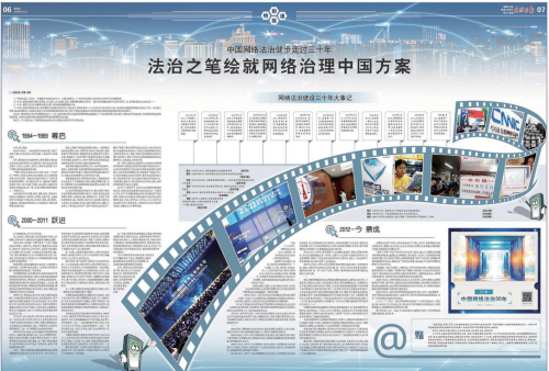 協(xié)調(diào)重要報(bào)道力量,采寫《中國(guó)網(wǎng)絡(luò)法治健步走過三十年法治之筆繪就網(wǎng)絡(luò)治理中國(guó)方案》報(bào)紙專版稿件,采用通版對(duì)開形式呈現(xiàn)。綜述文章雋永厚重,版面視覺效果恢弘大氣,圖文并茂地對(duì)《中國(guó)網(wǎng)絡(luò)法治三十年》報(bào)告進(jìn)行了全面解讀,獲得全網(wǎng)廣泛傳播。在該專版中,既集納傳統(tǒng)的報(bào)紙通訊、記者手記等文字報(bào)道,又運(yùn)用多種媒體元素、創(chuàng)新設(shè)計(jì)報(bào)紙版式。橫跨全版的“時(shí)光膠卷”一氣呵成,讓網(wǎng)絡(luò)法治建設(shè)三十年大事記躍然紙上。同時(shí),放置新媒體“門票”海報(bào),讓讀者沉浸式體驗(yàn)網(wǎng)絡(luò)法治建設(shè)的歷史成就。