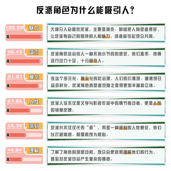 小紅書平臺,搜集“為什么反派角色更吸引人?”相關(guān)貼文,整理分析后發(fā)現(xiàn),演員出色的演技是刻畫反派角色的基礎(chǔ)。令觀眾著迷的,往往是反派角色身上的多面性,反派角色的“惡”并不僅僅是字面意思,它是一種復(fù)雜的、深刻的人性象征,更像是一道令人捉摸不透的難解謎題。