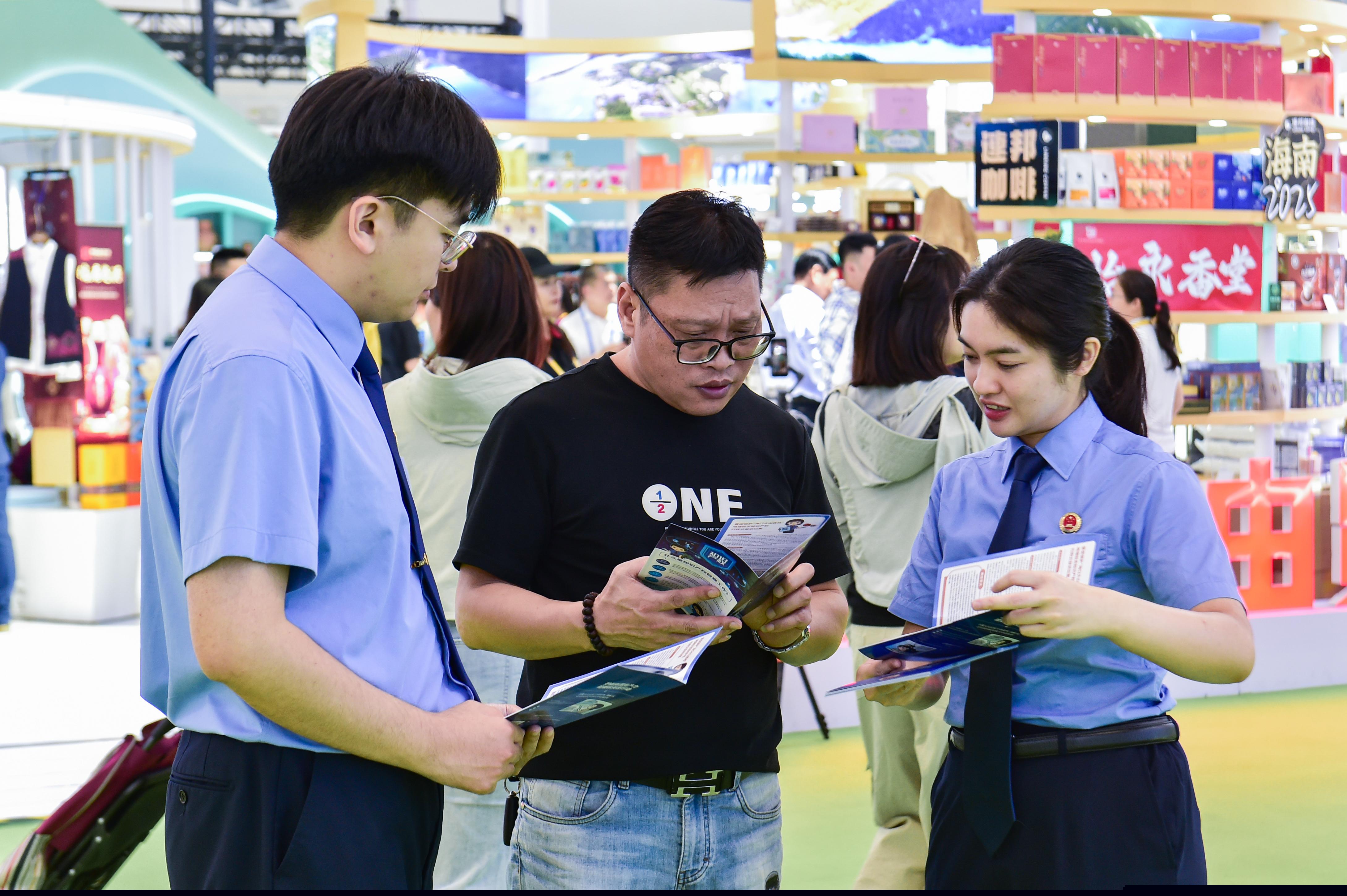 作為消博會人員最密集的區(qū)域,登陸大廳是消費者進入展館的“第一站”。本屆消博會,省檢察院指派省檢察院第一分院和海口市秀英區(qū)檢察院業(yè)務(wù)骨干進駐登陸大廳知識產(chǎn)權(quán)保護工作站,設(shè)立“知識產(chǎn)權(quán)檢察服務(wù)專區(qū)”,開展知識產(chǎn)權(quán)保護服務(wù)和普法宣傳工作。同時,檢察干警還深入各場館,主動與參展客商進行交流,深入了解知識產(chǎn)權(quán)保護方面新需求、新動向,并針對較為關(guān)注的商標保護、商標侵權(quán)維權(quán)、侵犯商業(yè)秘密等問題,逐一耐心細致解答,精準提供快捷高效的維權(quán)途徑和解決方案,為消博會創(chuàng)造法治化營商環(huán)境。