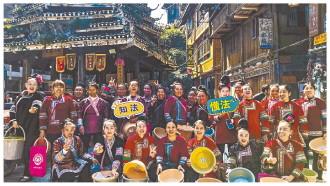 圖為普法志愿者在黎平縣肇興侗寨禮團(tuán)鼓樓舉辦“巾幗普法大闖關(guān)”競(jìng)答和“侗歌普法”活動(dòng)。 李春梅 攝