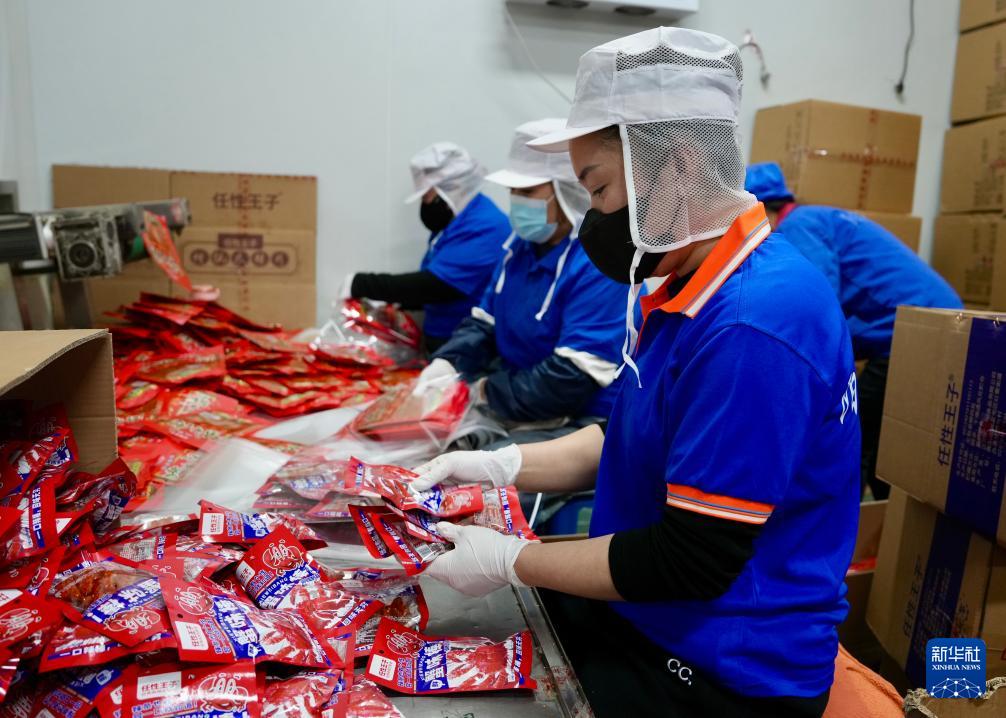 4月8日,在沈陽市陽陽食品有限公司,工人將辣條打包裝箱。