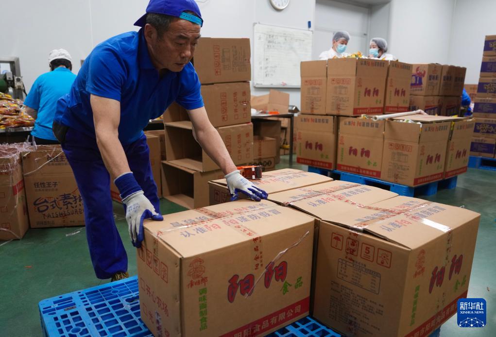 4月8日,在沈陽市陽陽食品有限公司,工人搬運辣條。
