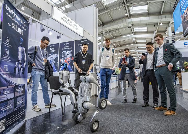 2025年4月1日,在德國漢諾威工業(yè)博覽會(huì)上,人們在宇樹科技展區(qū)觀看機(jī)器狗演示。新華社記者 張帆 攝