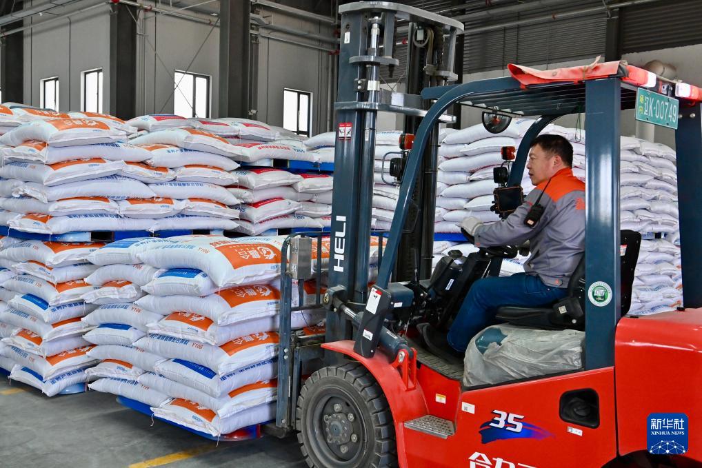 4月24日,在位于遼陽市的遼寧鑫金科技實(shí)業(yè)集團(tuán)有限公司的飼料廠內(nèi),工人使用叉車搬運(yùn)飼料。