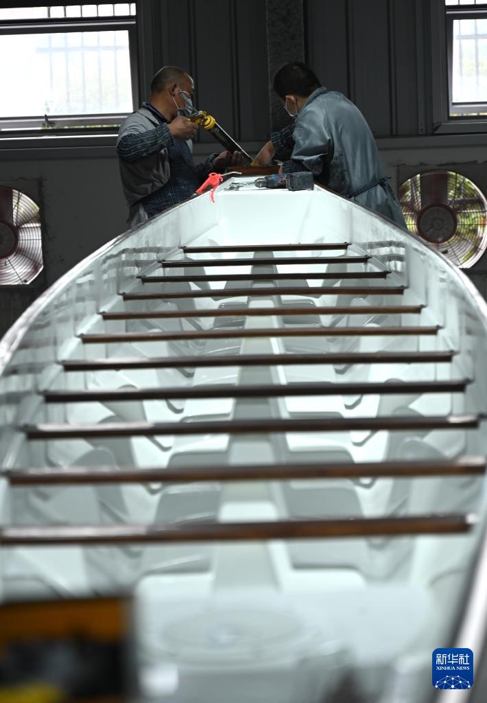 4月24日,在速力復(fù)合材料有限公司的生產(chǎn)車間內(nèi),工人在檢查一艘即將出廠的龍舟。