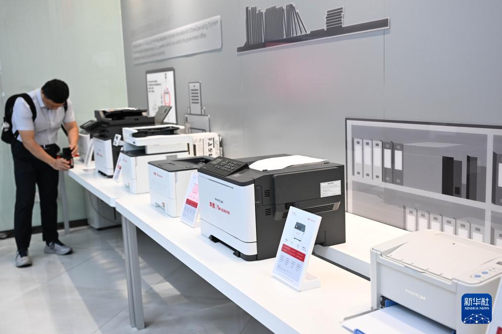 4月29日,參觀者在珠海納思達(dá)股份有限公司拍攝奔圖打印機(jī)系列產(chǎn)品。