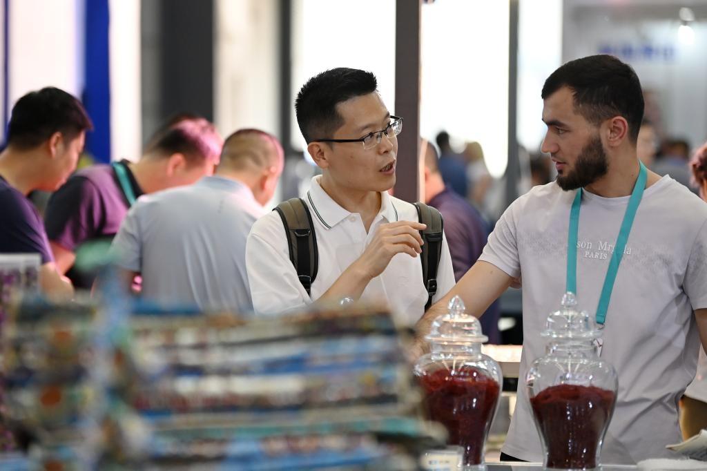 5月21日,在第九屆絲綢之路國際博覽會暨中國東西部合作與投資貿(mào)易洽談會絲路優(yōu)品展上,參觀者與參展商交流。新華社記者 李一博 攝