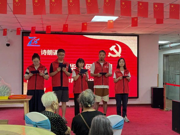 值此“七一”前夕,志愿者們把精心準備的紅色詩朗誦《何以華夏 何以中國》送給老人們。志愿者們深情飽滿的演繹,吟誦出華夏大地的輝煌歷史與文化底蘊,讓在場的每一位中華兒女為之自豪。