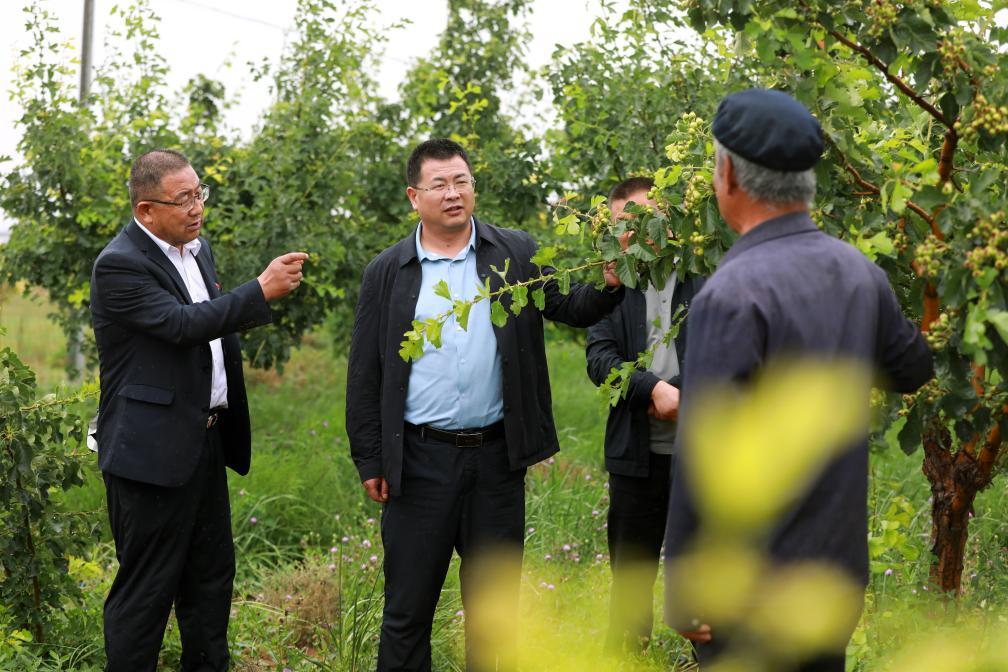 在富民新村的經(jīng)濟林栽植區(qū),古浪縣委組織部常務(wù)副部長俞永文(左二)與富民新村黨委書記兼村委會主任張延堂(左一)在和種植戶交流。新華社記者 郭剛 攝
