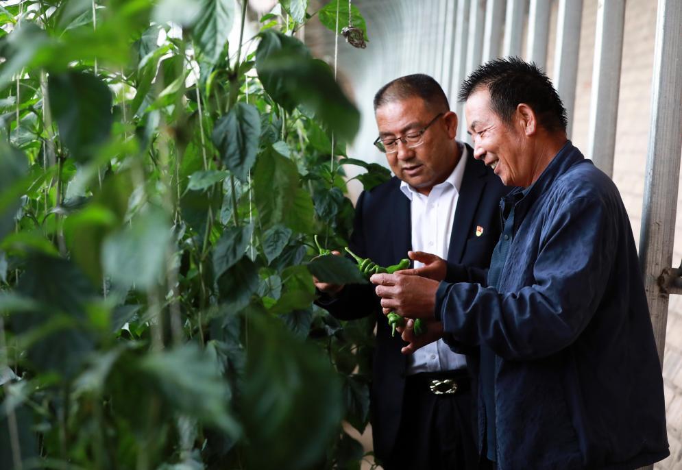 在富民新村種植區(qū)的日光溫室內(nèi),富民新村黨委書記兼村委會主任張延堂(左)在與種植戶何振田查看辣椒長勢。新華社記者 郭剛 攝