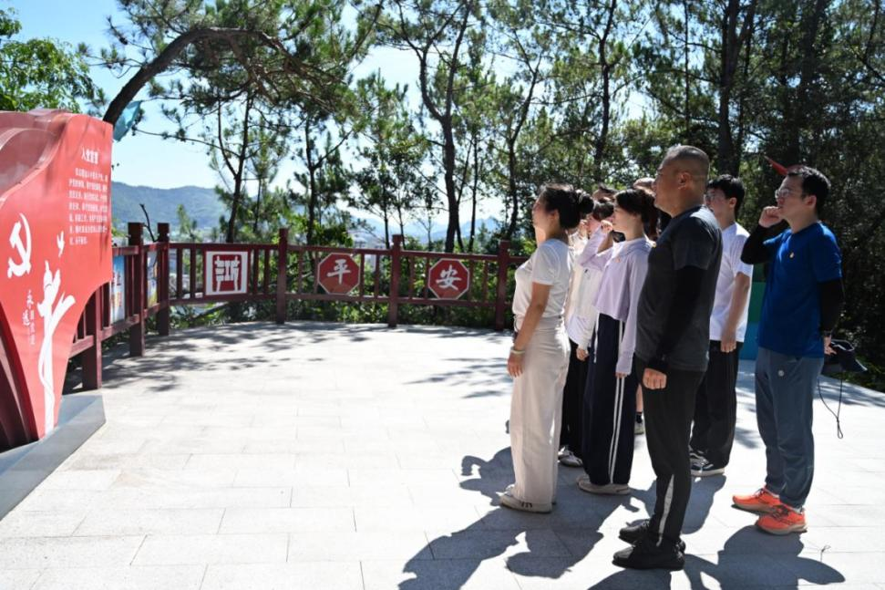 當天上午,公園山步道入口,員工們沿著青石山道拾級而上,在司旗輕舞中,開啟紅色傳承之旅。行過百十臺階,一座由五個紅五星拱門組成的長廊掩映于青山綠翠間,百年黨史濃縮在長廊兩邊紅色飄帶形狀的黨建墻之上。一行人如同穿梭于時光隧道,經(jīng)過“1921石庫門”“1934長征門”“1949解放門”“1978幸福門”最終到達“2021復興門”。沿途,大家不時駐足,認真閱讀紅墻上記載的從黨的一大至十九大會議的歷史沿革,學習感悟紅船精神、長征精神、紅巖精神、遵義會議精神、抗美援朝精神以及抗洪、抗震、抗疫等黨的各個時期所體現(xiàn)的革命精神和自強不息的奮斗精神。行程中,面對莊嚴的入黨誓詞墻,黨員們重溫入黨誓詞儀式。站在觀景平臺遠眺,員工們感慨于新農(nóng)村建設欣欣向榮的景象,找尋著綠色映襯下遠處甬城的最高樓,深切體會到“美好生活”背后承載的錚錚諾言和肩負的責任。