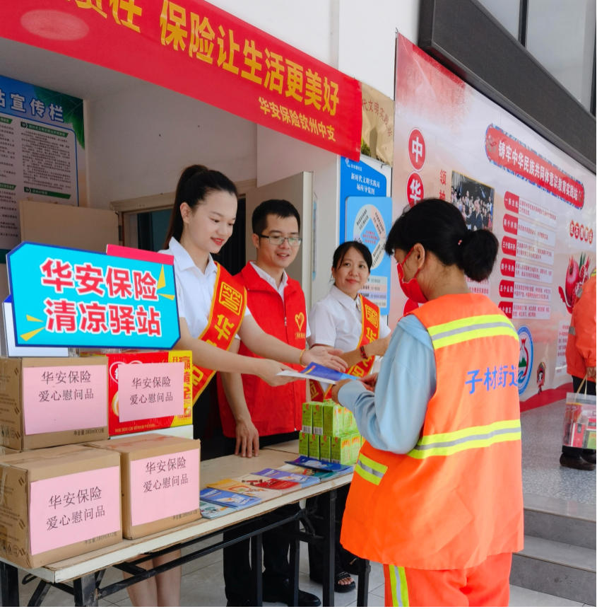 在廣西欽州白水塘社區(qū),華安保險(xiǎn)的工作人員在開(kāi)展“清涼驛站”活動(dòng)慰問(wèn)環(huán)衛(wèi)工人的同時(shí),也向往來(lái)群眾開(kāi)展防范非法金融活動(dòng)宣傳;界首支公司在職場(chǎng)外設(shè)置了“清涼驛站”,連續(xù)多日為環(huán)衛(wèi)工人送上飲品、藥品和毛巾等防暑降溫物資;在湖北襄陽(yáng),工作人員前往襄州區(qū)西灣社區(qū)紅色驛站,把“清涼驛站”設(shè)在“紅色驛站”旁,一邊帶領(lǐng)員工開(kāi)展紅色教育,一邊走進(jìn)社區(qū)開(kāi)展保險(xiǎn)宣傳,將紅色文化與保險(xiǎn)互助理念相融合;在云南曲靖,華安保險(xiǎn)的員工參觀紅軍博物館重溫入黨誓詞,并在三百戶(hù)營(yíng)村廣場(chǎng)組織員工和村民開(kāi)展長(zhǎng)征精神與保險(xiǎn)知識(shí)有獎(jiǎng)問(wèn)答活動(dòng);在合肥蜀山區(qū)大溪地商業(yè)廣場(chǎng),華安保險(xiǎn)以“納涼+公益咨詢(xún)”的創(chuàng)新形式開(kāi)展宣傳,為往來(lái)客戶(hù)送去納涼神器同時(shí),也把更多金融提醒向公眾進(jìn)行宣傳;7月7日下午,華安保險(xiǎn)湖南分公司在長(zhǎng)沙東方悅鄰商業(yè)廣場(chǎng)設(shè)立宣傳展臺(tái),工作人員開(kāi)展夏季用電安全知識(shí)有獎(jiǎng)測(cè)試,并向過(guò)往市民普及保險(xiǎn)知識(shí)、反欺詐技巧,同時(shí)為外賣(mài)和快遞小哥贈(zèng)送消暑飲用水。