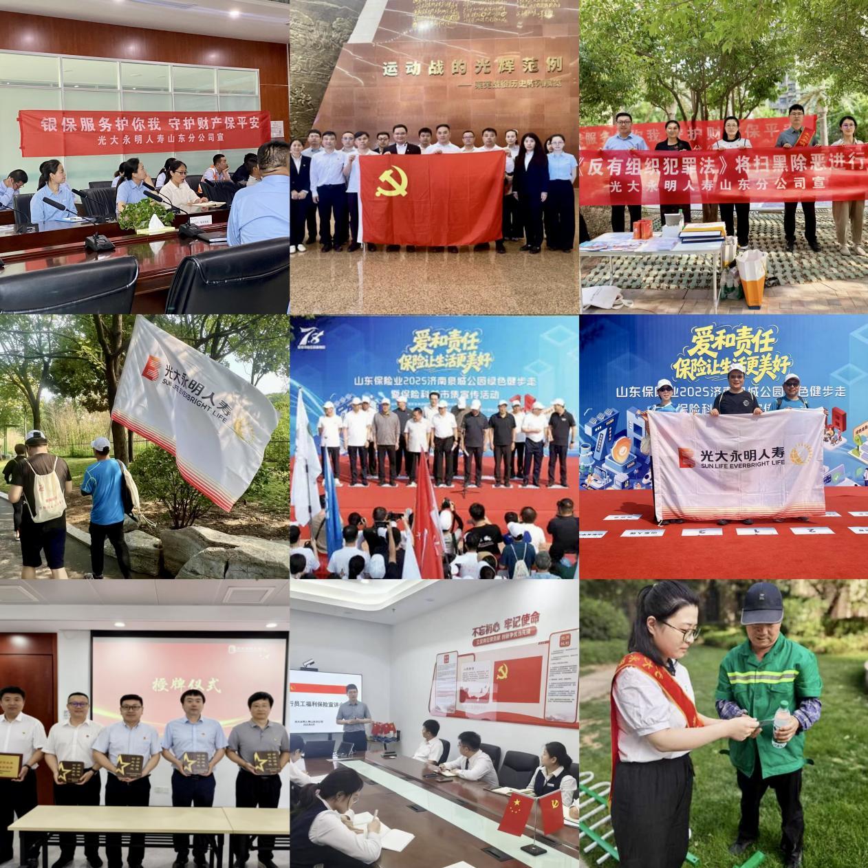 在“7.8全國(guó)保險(xiǎn)公眾宣傳日”活動(dòng)期間,光大永明人壽山東分公司以“愛(ài)和責(zé)任 保險(xiǎn)讓生活更美好”主題為支點(diǎn),在國(guó)家金融監(jiān)督管理總局山東監(jiān)管局和山東省保險(xiǎn)行業(yè)協(xié)會(huì)部署指導(dǎo)下,總分聯(lián)動(dòng)、渠道協(xié)同,開(kāi)展了紅色教育、金融知識(shí)宣教、理賠服務(wù)宣傳和參與綠色健步走等系列活動(dòng),凝聚力量,傳遞愛(ài)心,折射責(zé)任之光。