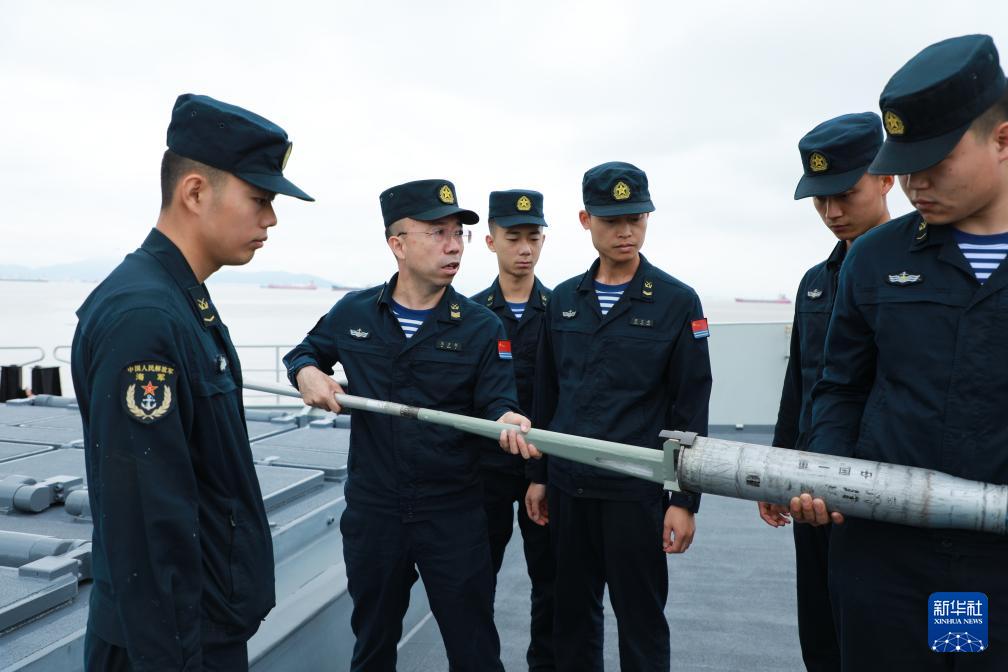 海軍資陽艦主炮區(qū)隊(duì)長馬少利(左二)向戰(zhàn)友演示專業(yè)工具使用方法(6月11日攝)。新華社記者 李秉宣 攝
