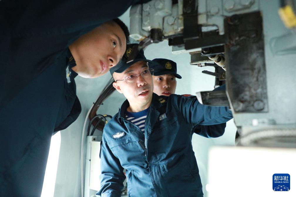 海軍資陽艦主炮區(qū)隊(duì)長馬少利(中)帶領(lǐng)戰(zhàn)友進(jìn)行裝備檢視(6月11日攝)。新華社記者 李秉宣 攝